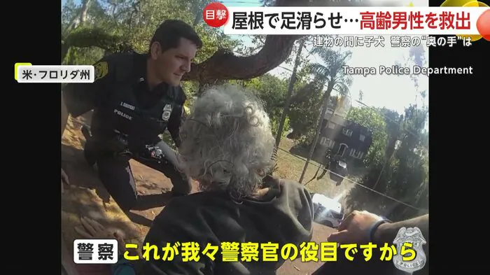 アメリカ・フロリダ州にある住宅の屋根の上でうつ伏せになった高齢男性がカメラに捉えられた。男性は落ち葉を片付けようとして転倒し、身動きが取れなくなっていたといい、現場に駆けつけた警察官が救出した。一方、アリゾナ州では狭い隙間に入り込んだ子犬を即席の器具で助け出す様子も撮影されている。