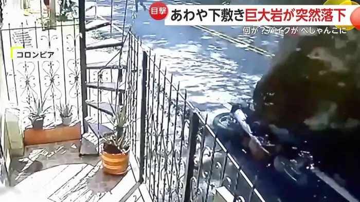 大きな音に気づいた人々は危険を察知し、必死に逃げようとしていたが、直後に巨大な岩が落下、置き去りにされたバイクが押しつぶされた。