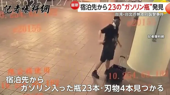 19日、台湾の台北市で起きた無差別襲撃事件で、容疑者の宿泊先からガソリンが入った瓶23本などが見つかった。