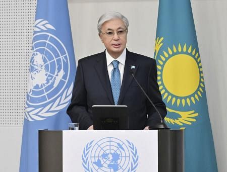19日、東京都渋谷区の国連大学で講演するカザフスタンのトカエフ大統領(カザフスタン大統領府提供)