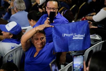 ホンジュラス大統領選でアスフラ氏の「勝利」を喜ぶ支援者ら=24日、テグシガルパ(ロイター=共同)