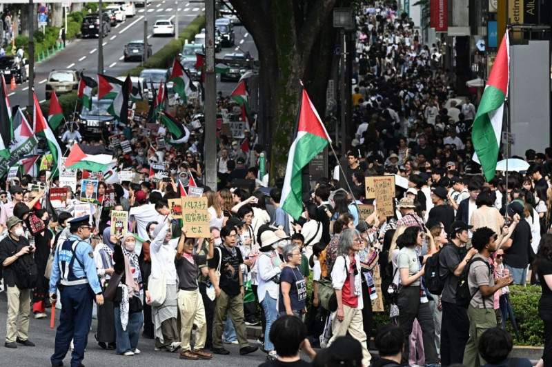 イスラエルのパレスチナ自治区ガザ侵攻に抗議するデモ隊=6月15日、東京都渋谷区で