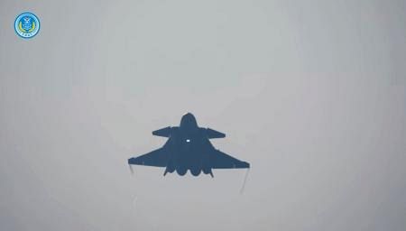 飛行する中国軍の軍用機。同軍の東部戦区が2025年12月30日に台湾周辺での軍事演習の一場面として「微信(ウィーチャット)」の公式アカウントに投稿した(共同)