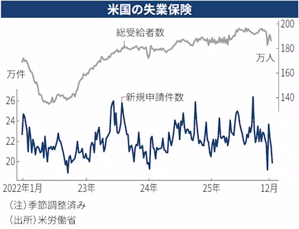 12月14〜20日の総受給者数は186万6000人と、前の週の改定値から4万7000人減った。総受給者数は2022年6月の約135万人を底に増加基調に転じ、25年5月以降は190万人前後で推移している。