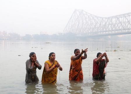 ガンジス川で沐浴する女性ら=2025年12月8日、インド東部コルカタ(ロイター=共同)