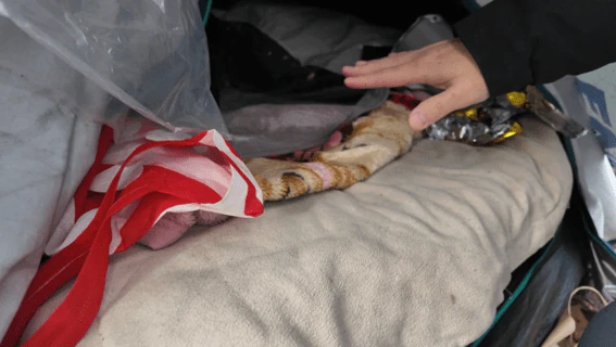 テントは、簡易ベッドのようなもので底上げされ、上部には工事現場で拾ってきたという防水のカバーが掛かっていた。テント内は、人ひとりが横になるのがやっと。衣服などの最低限の必需品が中に詰め込まれていた。