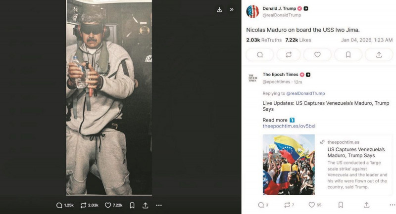 トランプ大統領が自身のSNSに公開した移送中のベネズエラのマドゥロ大統領の写真(左)。米海軍強襲揚陸艦の「イオー・ジマに乗艦したニコラス・マドゥロ」との説明文がある
