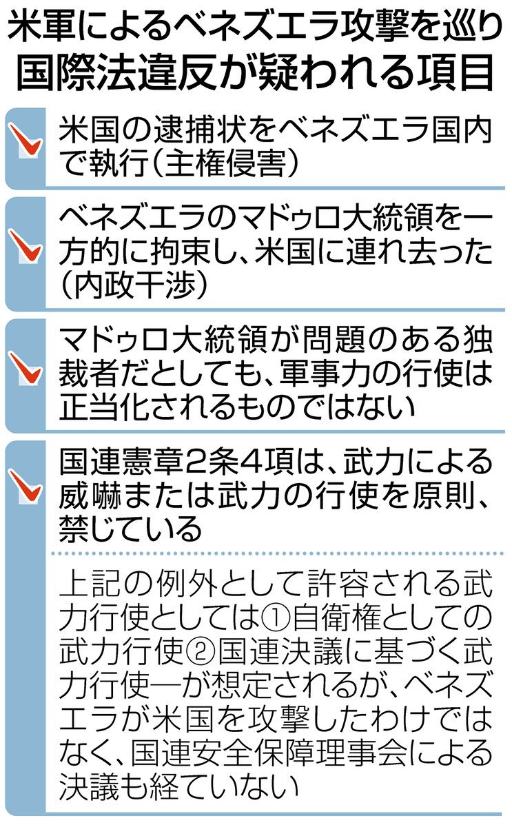 そもそも武力行使は、国連憲章2条4項で原則、禁じられている。米国が自衛権の行使を主張しても、米国がベネズエラから攻撃されていたわけではないので「無理筋な議論だ」と山田氏はみる。国連安保理の決議を経ていたわけでもなく、例外的な武力行使だとするのは困難だ。 ただ、報道では「国際法違反の疑い」などと慎重な言葉遣いが続いている。各国政府も、違法性への言及はばらつく。山田氏は「国際法の解釈は、まずはそれぞれの国家がする」と説明。各国の公の場での発言や、安保理決議などによって解釈が固まっていくという。その上で今回の攻撃については「国際社会における法の支配がますます揺らぎかねない」と懸念する。◆ロシアや中国が「アメリカを見習うことが心配」