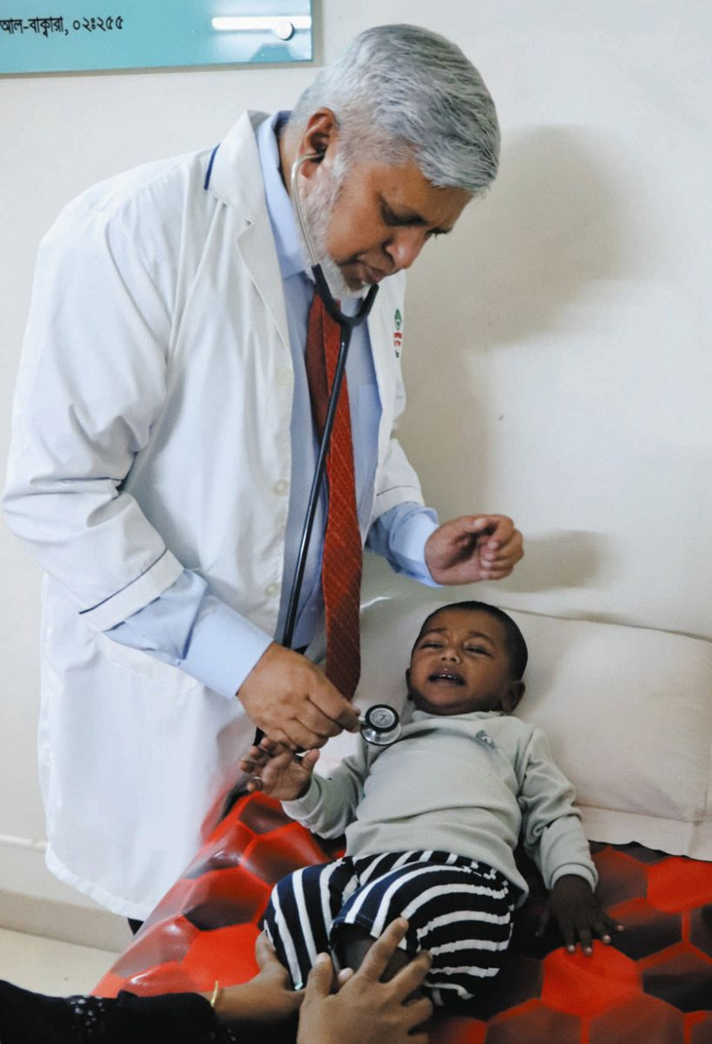 アイチホスピタルで11月20日、子どもを診察するモアゼム・ホセインさん=ダッカで