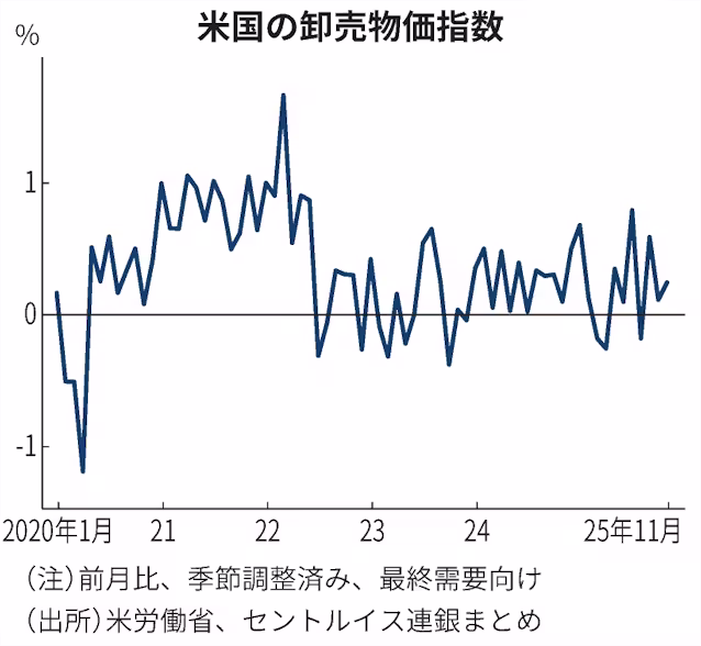 【ワシントン=野一色遥花】米労働省が14日発表した2025年11月の卸売物価指数(PPI、最終需要向け、季節調整済み)は前月比0.2%上昇した。0.3%増とする市場予想(ダウ・ジョーンズまとめ)は下回った。