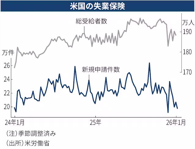 【ワシントン=野一色遥花】米労働省が15日発表した失業保険統計(季節調整済み)によると、企業の解雇動向を映す失業保険の新規申請件数は1月4〜10日に19万8000件だった。ダウ・ジョーンズ集計の市場予想の21万5000件を下回った。