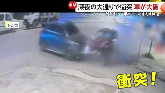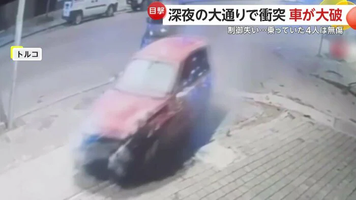 トルコにある大通りで、制御を失った車が停車中の車に衝突する様子がカメラに捉えられた。衝突で止めてあった車も大きくはじき飛ばされ、ぶつかった車もフロント部分が大破。しかし乗っていた人たちは奇跡的に全員無傷だったという。