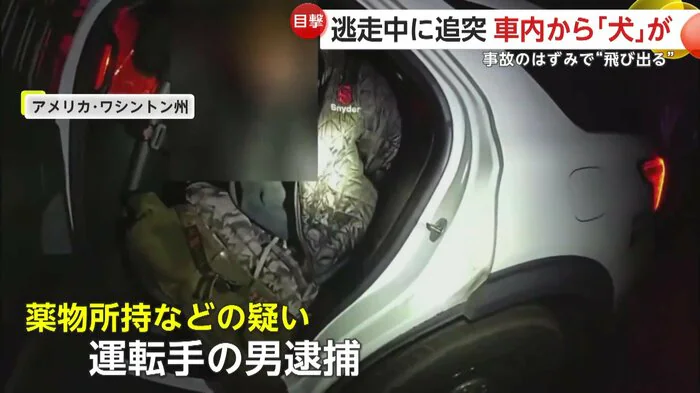 アメリカ・ワシントン州で、カーチェイスの様子がカメラに捉えられた。逃走車はT字路で茂みに突っ込んで停車。衝突の衝撃で車から犬が投げ出される様子も見られた。警察官は男女を確保し、投げ出された犬も無事に発見されたという。