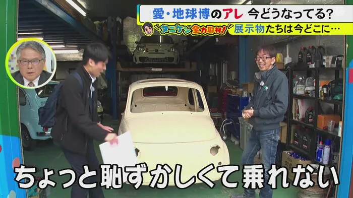 イタリア館で展示されていたボディー全面にホワイトチョコレートがコーティングされたチンクエチェント(フィアット500)。所有しているという博物館の館長を訪ねるため、瀬戸市へ向かいました。