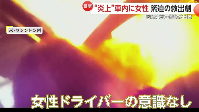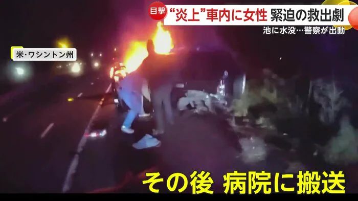 アメリカ・ワシントン州で、炎上車から意識を失ったドライバーを救出する瞬間がカメラに捉えられた。