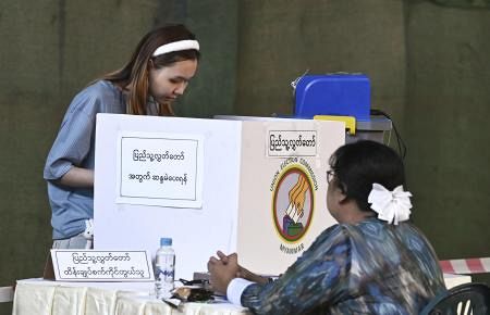 25日、ミャンマー・ヤンゴンで投票する有権者(共同)