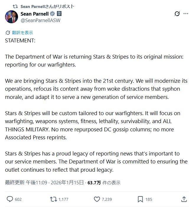 米国国防総省のショーン・パーネル報道官が1月15日、自身の公式Xに投稿した星条旗新聞の編集権に関する声明(スクリーンショット)