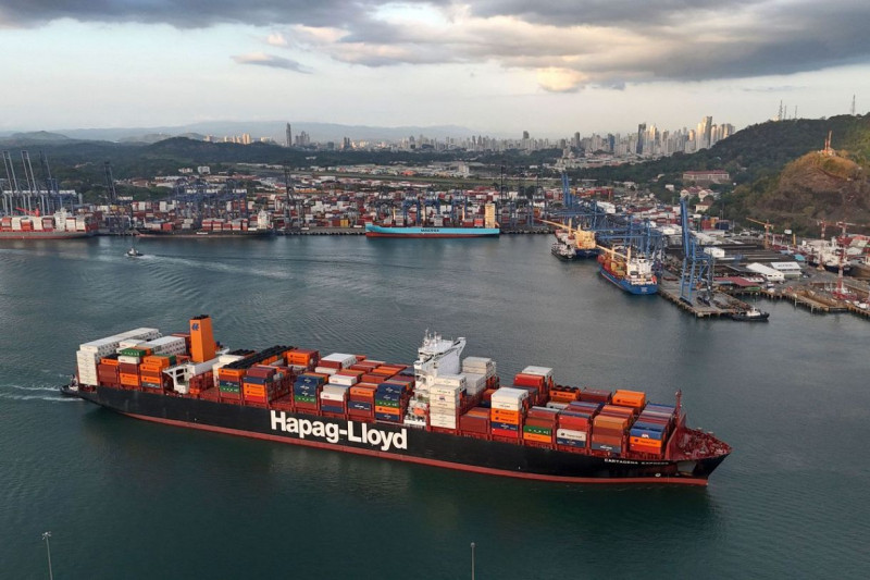 パナマ運河の港を航行する貨物船=2025年3月、パナマ市(AP=共同)