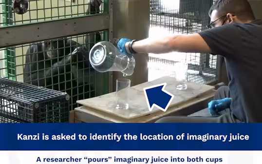 まずカンジが存在しないジュースを想像できるか検証した。具体的には2つの空のコップを用意して片方のコップにジュースを注ぐジェスチャーをした。カンジに「ジュースはどこ?」と聞くと50回のうち34回(68%)、想像上のジュースが入ったコップを指さした。
