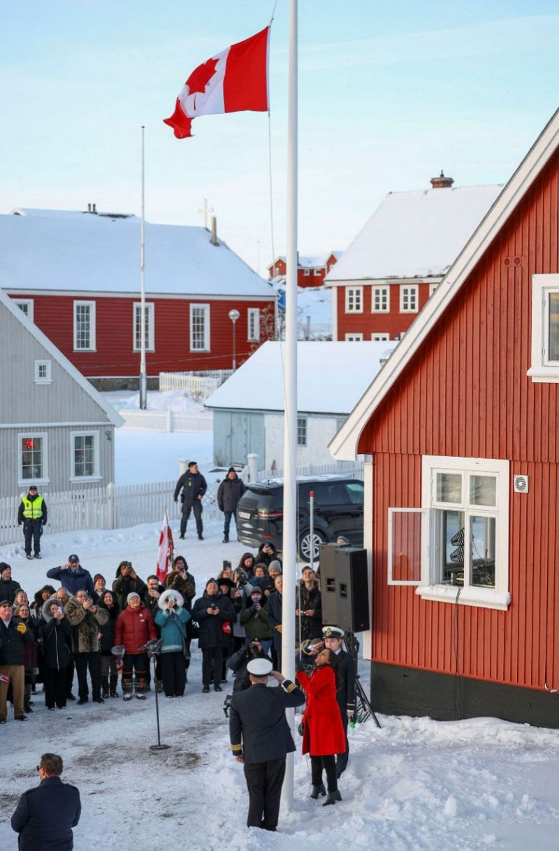 領事館開設で掲げられたカナダ国旗=6日、グリーンランド・ヌーク(ロイター=共同)