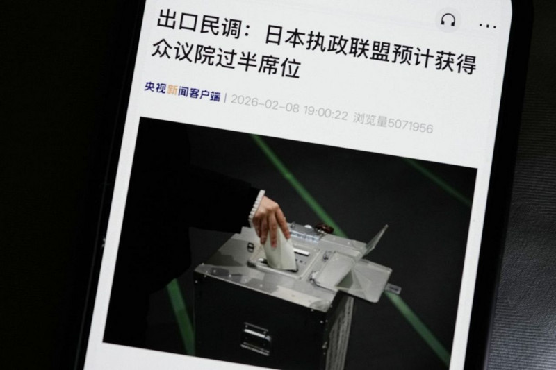 衆院選で自民党と日本維新の会の与党が過半数の議席を獲得する見込みだと速報する中国国営中央テレビ電子版=8日、北京(共同)