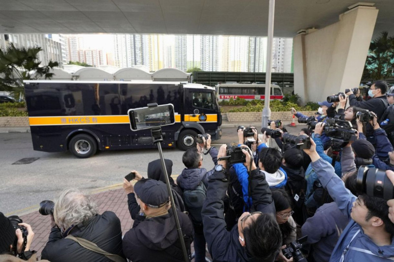 裁判所に入る黎智英氏を乗せたとみられる車両=9日、香港(共同)