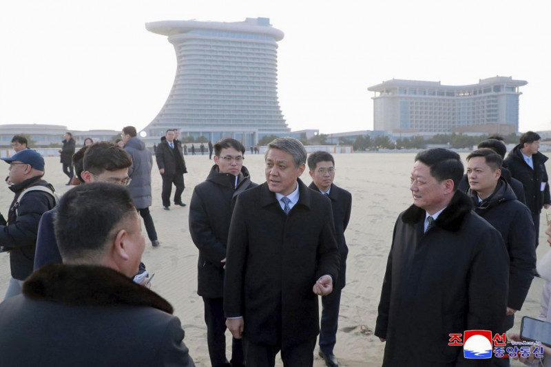 北朝鮮東部・江原道の元山葛麻海岸観光地区のリゾート施設を訪れた中国の王亜軍駐北朝鮮大使(手前中央)=14日(朝鮮中央通信=共同)