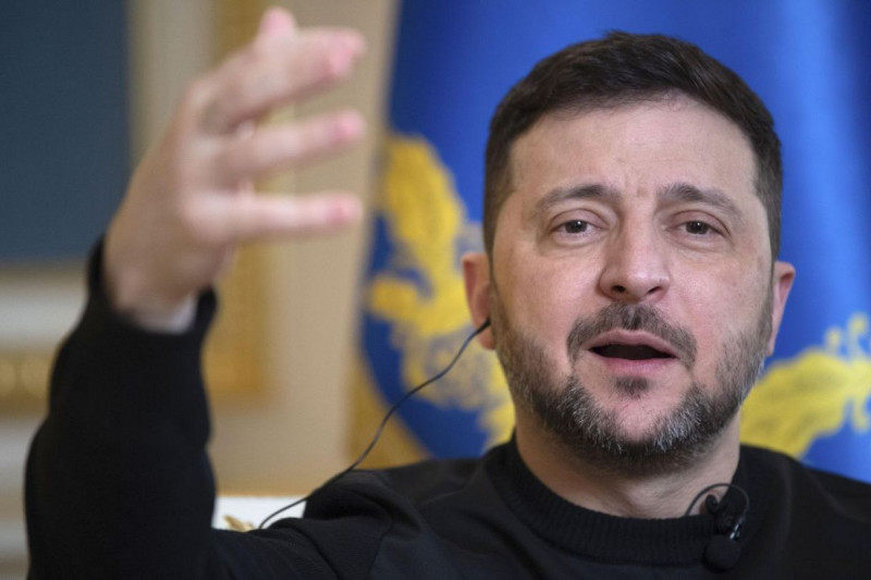 ウクライナの首都キーウで共同通信と単独会見するゼレンスキー大統領=19日(共同)
