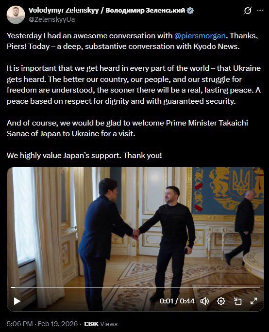 19日に共同通信と単独会見したウクライナのゼレンスキー大統領のX(旧ツイッター)への投稿(共同)