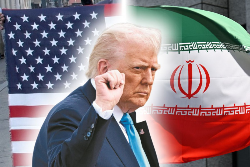 トランプ大統領。背景はアメリカ(左)とイランの国旗=いずれも資料写真、コラージュ