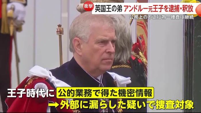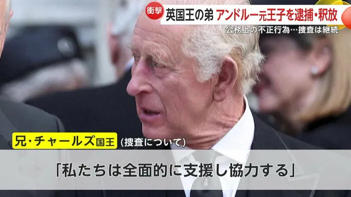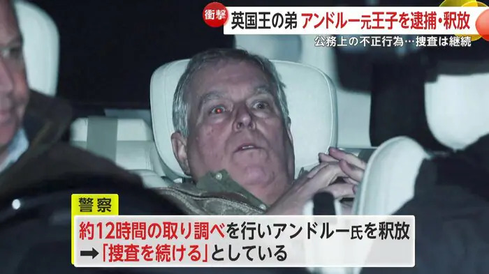 イギリスのチャールズ国王の弟・アンドルー元王子(66)が19日、公務上の不正行為の疑いで逮捕され、王室に衝撃が広がっている。性的虐待などの罪で起訴されたエプスタイン氏との関係が捜査の焦点で、機密情報漏えいの疑いが持たれている。取り調べの約12時間後に釈放されたが、捜査は継続される見通しだ。チャールズ国王は深い懸念を示し、全面的な協力姿勢と「法に委ねるべきだ」との声明を発表した。