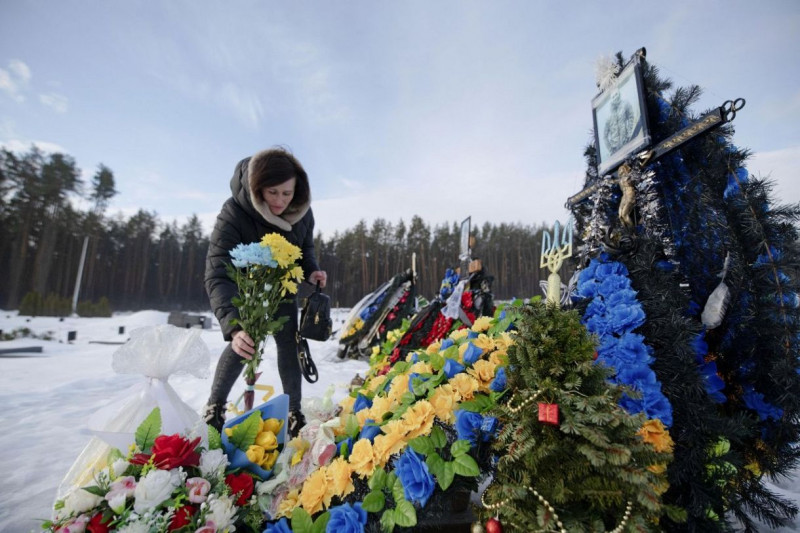 ロシアのウクライナ侵攻開始から4年となった24日、首都キーウ近郊イルピンにある夫デニスさんの墓の前で涙をぬぐうイアナ・サクンさん(共同)