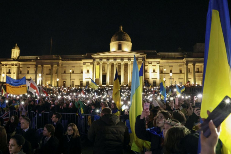 戦争の終結を願って集会に参加するウクライナ避難民ら=24日、ロンドン(共同)