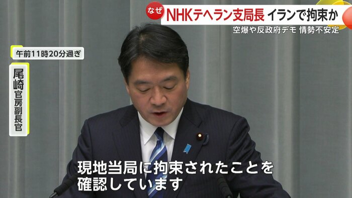 NHKのテヘラン支局長がイランで拘束されたという報道があり、尾崎官房副長官も拘束を確認していると明かした。