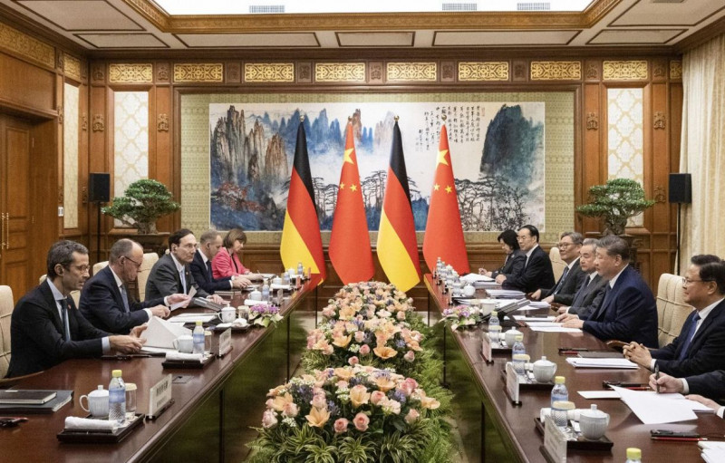 会談に臨む中国の習近平国家主席(右から2人目)とドイツのメルツ首相(左から2人目)=25日、北京の釣魚台迎賓館(共同)