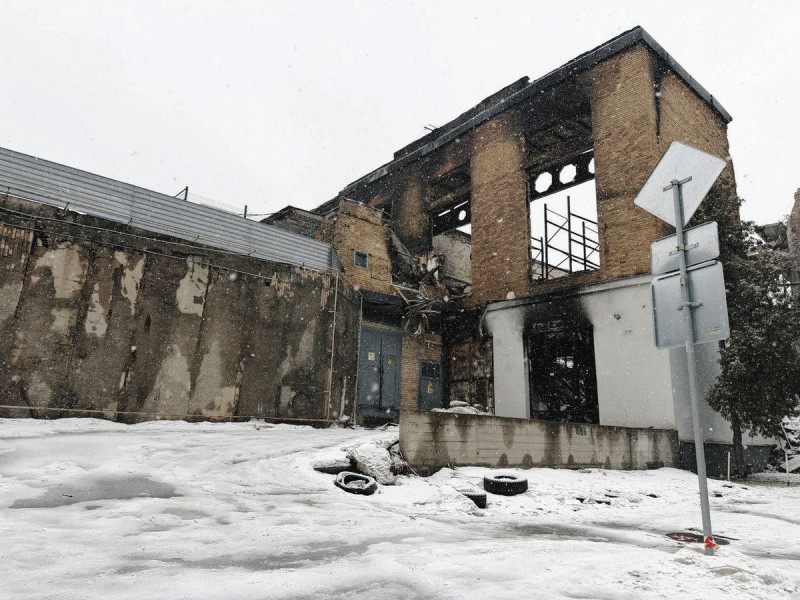 攻撃で破壊された建物=2月、ウクライナ・キーウ市内で(現地在住のルスラン・プルィルィプコさん提供)