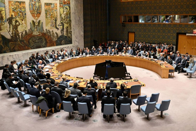 米ニューヨークの国連本部で開かれたイラン情勢を巡る安全保障理事会の緊急会合=2月28日(共同)