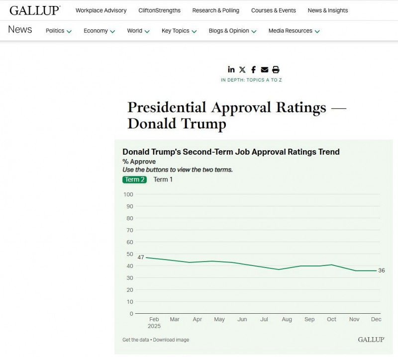 米国の調査会社ギャラップ社のホームページ上で、トランプ大統領支持率を示すページ(スクリーンショット)