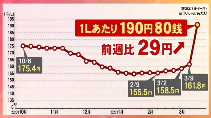 ガソリンの全国平均価格は18日、前の週から一気に29円あがり、1リットルあたり190円80銭と、過去最高額になりました。