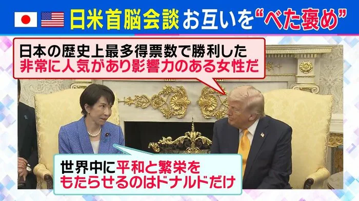 対するトランプ大統領は「日本の歴史上最多得票数で勝利した、非常に人気があり影響力のある女性だ」と、お互いにべた褒めするなど、和やかなムードで会談が進んだ。