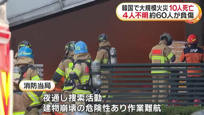 当時、ほとんどの従業員は工場2階にある休憩室にいたとみられ、韓国メディアによりますとこれまでに10人の死亡が確認され、約60人が負傷したということだ。