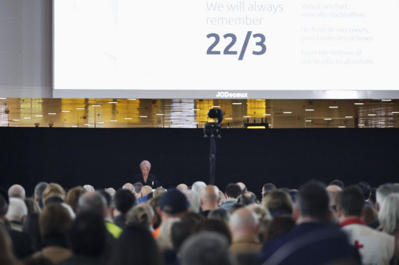 ベルギーのブリュッセル空港での追悼行事で、黙とうする人々=22日(共同)