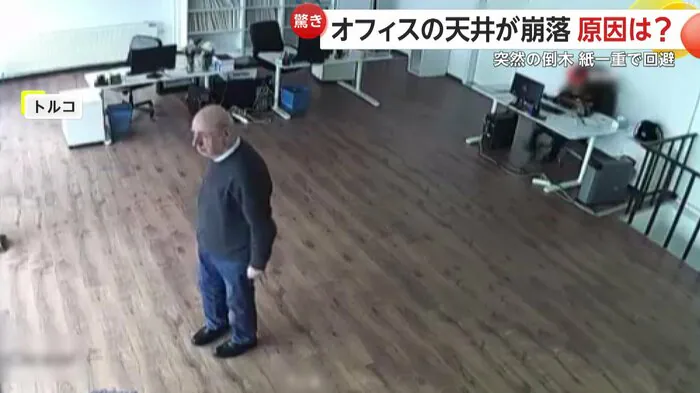 トルコにある建物内で、天井が崩れ落ちる瞬間がカメラに捉えられた。建物には人の姿があったが、異変に気がつくと大急ぎで避難していた。一方、別の場所では通行人に向けて木が倒れる出来事があった。通行人は間一髪で巻き込まれず、けがはなかったという。