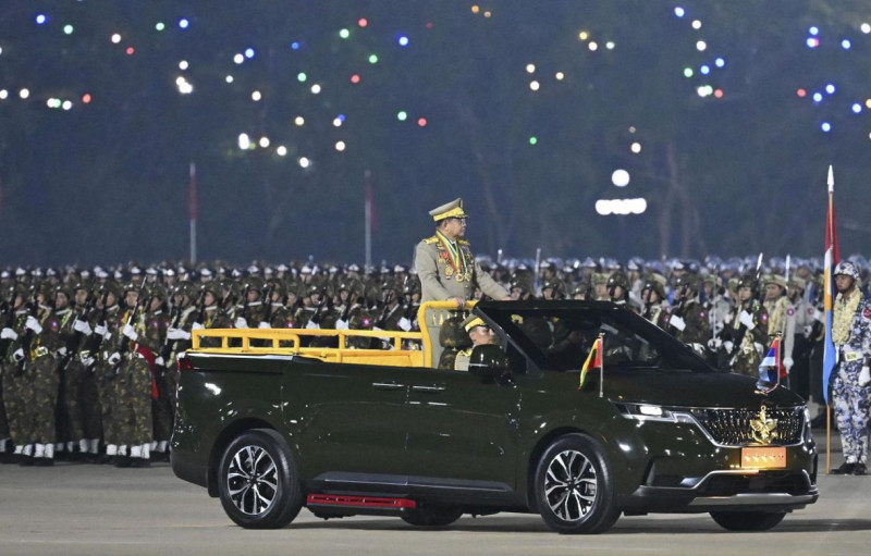 27日、ミャンマーの首都ネピドーで開かれた国軍記念日の式典に出席したミンアウンフライン国軍総司令官(中央)(共同)