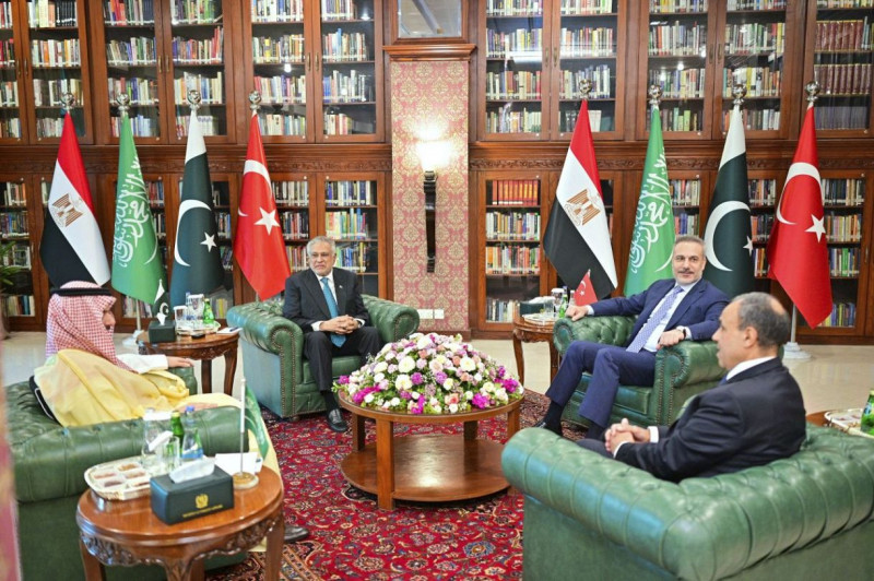 協議する(左から)サウジアラビア、パキスタン、トルコ、エジプトの各外相=29日、イスラマバード(パキスタン外務省提供・共同)