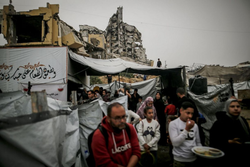 パレスチナ自治区ガザで支援団体による食事の配給を待つ人たち=2日(ゲッティ=共同)