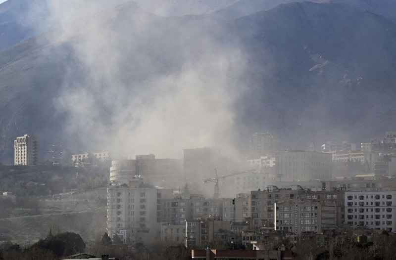 攻撃を受け、白煙を上げるテヘランの住宅街=3日(共同)