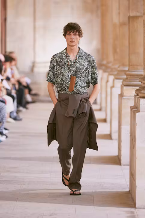 ランウエーに登場する服は、レザーやコートから、次第にシルクやハーフパンツに変わっていった。黒やグレーなどの深い色は、徐々にベージュや白などの軽やかな色味に。ぱきっとしたグリーンや赤が時折差し込まれ、中にはビーチバッグやサングラスケースも。