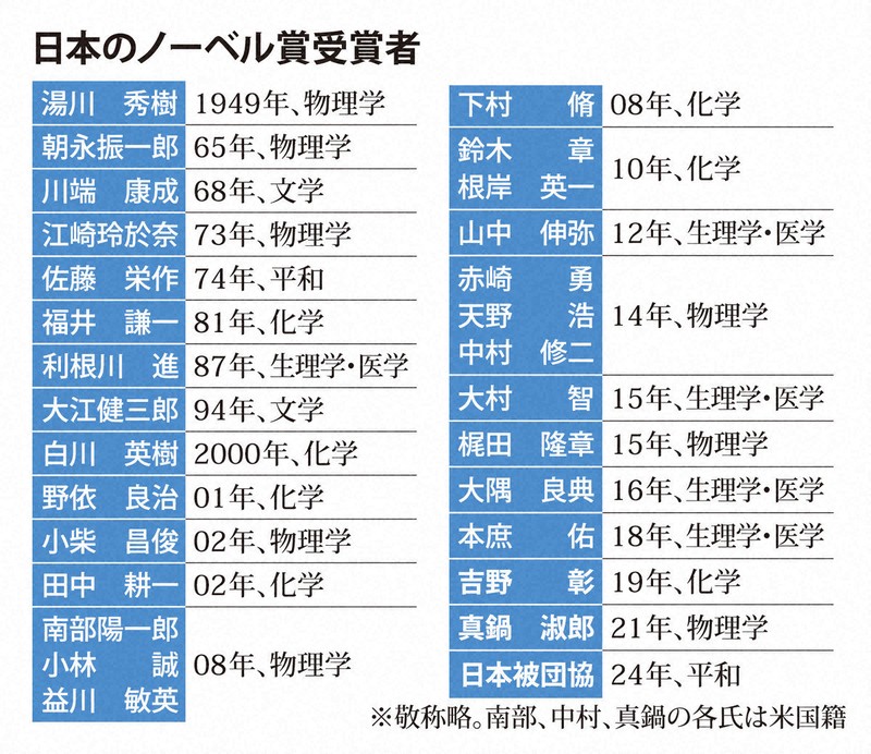 2024年度までの日本のノーベル賞受賞者は、個人では28人(米国籍の3人を含む)いるが、阪大の学部卒業生や在籍中の研究者で受賞した人はいなかった。