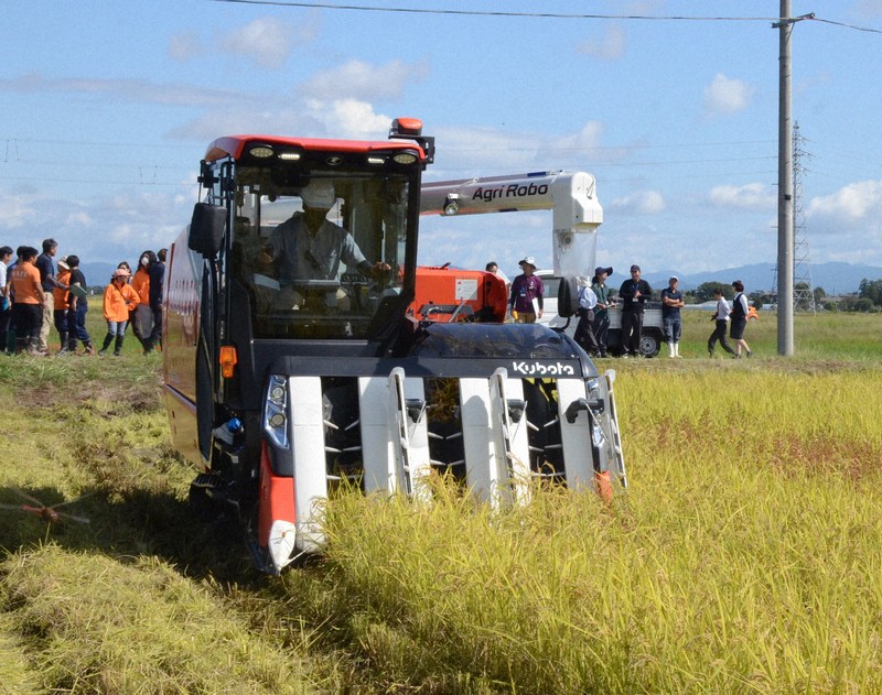 水を張らない乾いた田んぼに直接種をまく「節水型乾田直播(かんでんちょくは)栽培」。これまでの水稲栽培に比べ、省力化や効率化を図ることができ、規模拡大や需要に応じた増産にも対応可能だ。NSGグループの農業法人ベジ・アビオ(新潟市)は2日、この手法で栽培した稲の収穫作業を公開した。